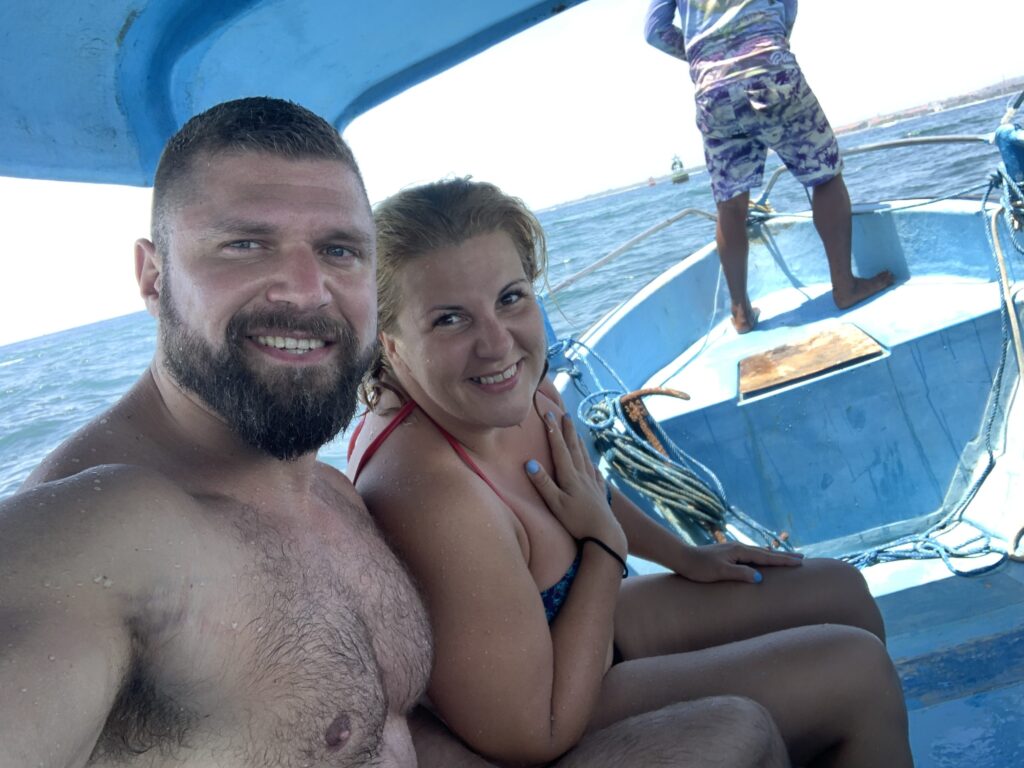 A snorkelling, az a fajta "búvárkodás" amikor kapsz egy békatalpat, búvárszemüveget, meg egy pipát, aztán lehet a kis halacskákat, meg korallokat nézegetni. ☺️Nem az első eset, hogy ennek nekifutottam - volt már ilyen Langkawiban (Malaysiaban), meg tavaly Dahabban is. Itt annyi volt a trükk, hogy nem a partról a vízbe besétálva uszikálsz el a látnivalókig, hanem beültetnek egy (részben) üvegaljú hajóba - áh! csónak az csak, vagy inkább motoros ladik - és vagy 10 percet mennek veled el a parttól.