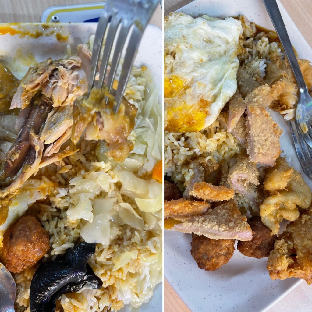 Reggelizni egy kb 200 méterre levő piacra mentünk – ami leginkább nem is piac, hanem egy piac jellegű tér, ahol mindenféle kifőzdék vannak. Gyakorlatilag az a hely ahol előző nap voltunk meg ez abban különbözik egymástól, hogy oda a turisták járnak kajálni, ide meg a helyiek és hogy itt az árak csöppet alacsonyabbak… mondjuk úgy 50%kal – ugyanakkor a kaják ugyanolyan zseniálisak, ízletesek, az adagok pedig jókorák. ‼️ A kontinentális reggelihez szokott olvasóknak a nyugalom megzavarására alkalmas részletek következnek ‼️ (akik meg ugye INTERKONTINENTÁLIShoz szoktak nekik már most készítsenek ki egy komolyabb savlekötőt is!) Az útitársaim is főleg a klasszikus rántotta, sonka, kenyér, vaj kombó felé orientálódtak volna, de végül a következők landoltak a tányérokban: rizs, csirkepaprikás combból, rántott hal, párolt zöldségek (leginkább olyan mint ami a kínaikban szerzetesek eledele néven futott régen), rántott sertés ollóval feldarabolva, húsgolyócskák, szójaszósz. Erős indítás volt asszem, de hát valamiből kell az energia 🙃.