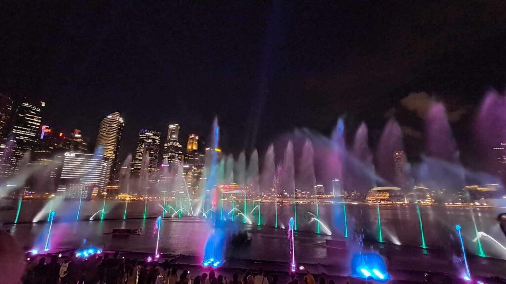 A sofőrünk ajánlására egy másik showt is megtekintettünk, ami Marina Baynél van. Bevallom, hogy annál giccsesebb és bazáribb szórakoztatást, minthogy az öbölbe telepített “szökőkutak” által nyomott vízre fényfestés kerüljön még nem biztos hogy láttam ebben az életbe… de persze lehet, hogy még mindig csak a kialvatlanság és az éhenhalás újból felbukkanó fenyegetése mondatta/mondatja ezt velem. Lehet valami itt a levegőben Szingapúrban - mióta leszálltunk én folyamatosan csak ennék. (Mondjuk ebben megint semmi újdonságtartalom nincs, mert ez helytől és időtől független életérzés nálam, ugye.) Azért egy darabig bírtam nézni, viszont Rudi kiváló fotót készített róla:
