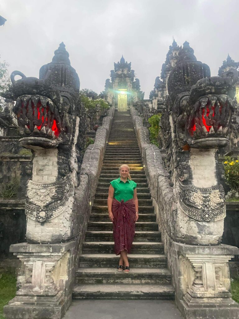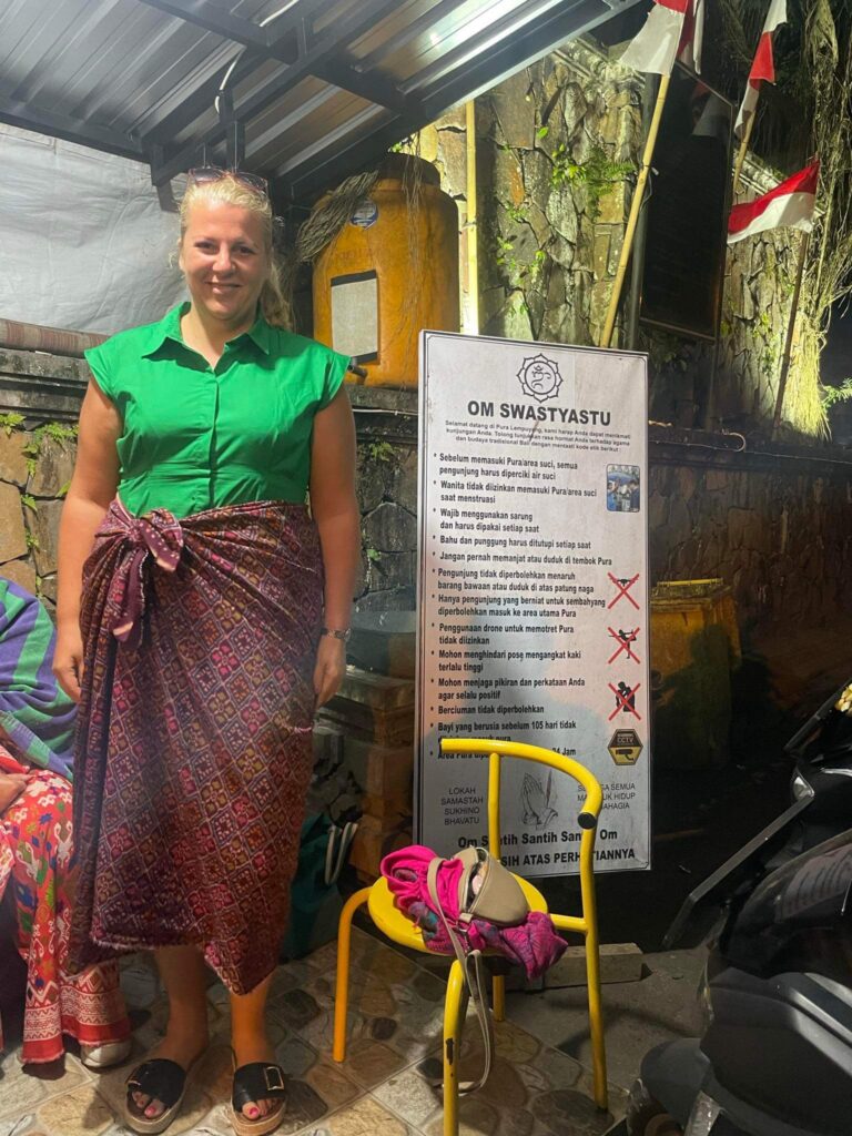 Bár a korábbi templomokba, simán be lehetett menni a rajtunk lévő ruhában (feltéve hogy térd alá ért), ide még úgy sem. Kötelező a sarung magadra kötése. Nekem az alábbi remek szín jutott - elégedett vagyok, na. 😂