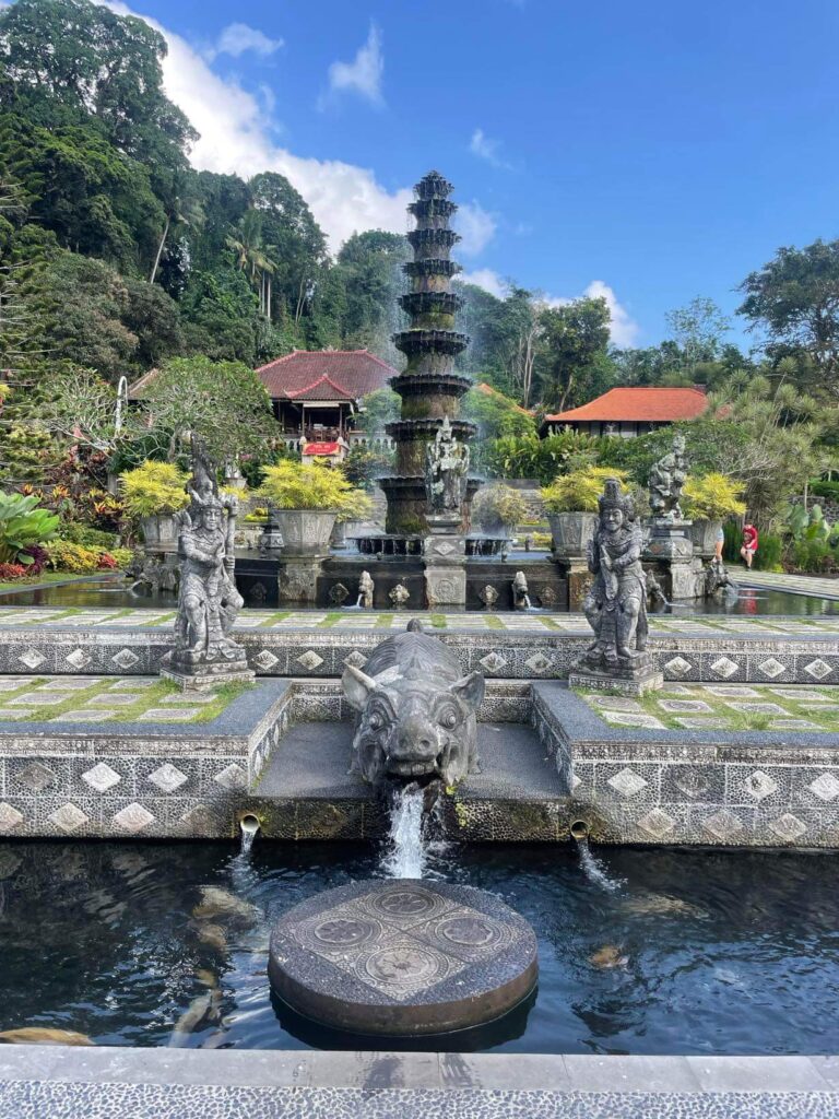 Következzék egy kis okosítás: a karangasemi királyi család egykori fürdője, a Tirta Gangga. A fürdőt egy hatalmas trópusi park közepére építették, rízsföldek, s hegyek gyűrűjében. Kertjében medencék, halastó és egy magas szökőkút áll. A név, Tirta Gangga az indiai szent Gangga folyóra utal, a tirta pedig balinéz nyelven szent vizet jelent. 🌊