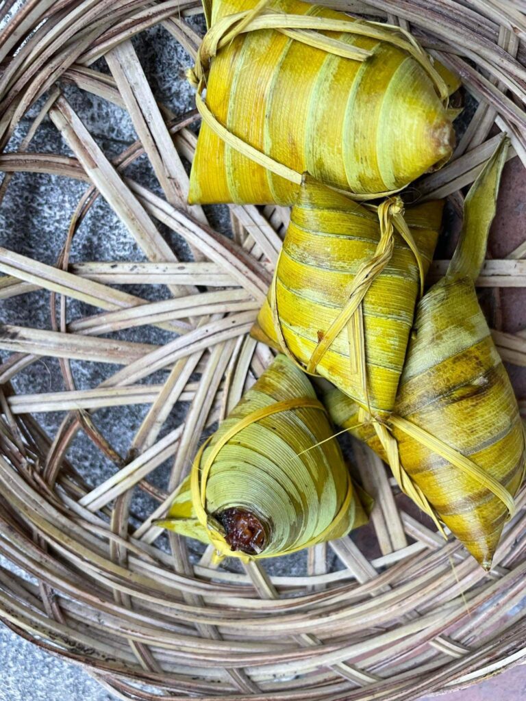 Dekrit hozott nekünk némi helyi kaját reggelire. Ezek a kis gubacsok konkrétan: banánlevélbe csavart főtt rizs-szotty banánnal. A rizst ebben az esetben olyan szottyosra főzik, amit mi már kb tejberizsnek hívnánk, de mivel ott nem rizsben főzik így csak egy rizs-szotty, ami viszont édes (nyilván a cukortól, ne legyenek kétségek).
