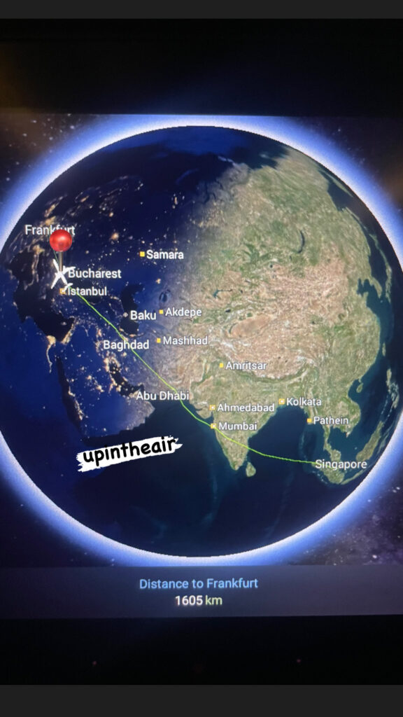 Beszállás megugorva és csodával határos módon újra sikerült úgy elhelyezkedni, hogy mindenki mellett akad egy üres hely - azaz a kényelem a turistaosztályon gyakorlatilag ki lett maxolva. Takarók, párnák dögivel. Vegyszer nélkül is sikeresen elaludtam, de holtfáradt amatőr módon, még a vacsi kiosztása előtt - úgyhogy felébresztettek. grrrr Innentől már csak a vegyszer segített amit Pufi adott, meg két advil mert migrénem is lett... én kérdeztem Csabitól, hogy nem kéne-e még egy tabit adnia mondván, hogy nyilván tömegarányosan azért...ööö...na, hogy elfér! De szerinte nem. Most már tudjuk: DE. 😛 A közel 13 órás útból, kb 5-6-ot sikerült aludni. Ez, gyakorlatilag rekord!! Hála a wifinek, meg a filmeknek Frankfurt már szinte karnyújtásnyira volt.
